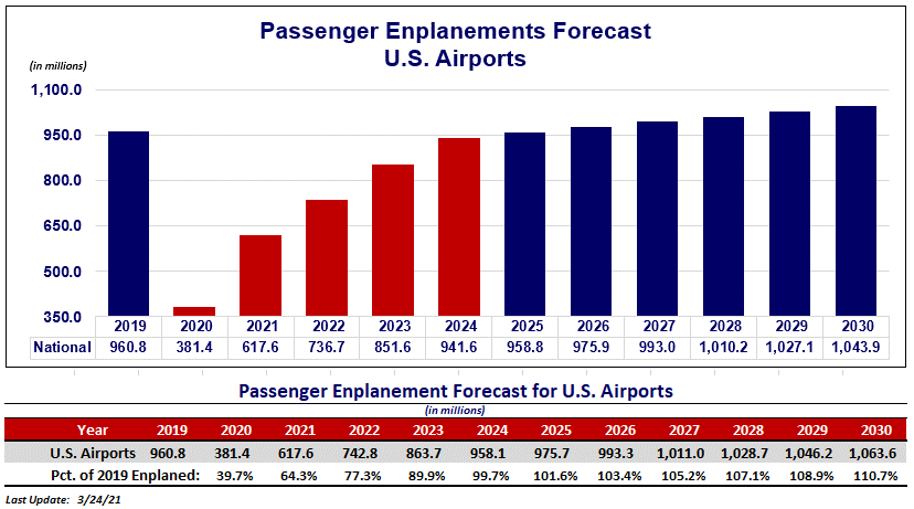 Based on known and expected airline capacity and fleet trends, the latest Airports:USA® forecasts indicate 2021 on track for just under 620 million enplanements.