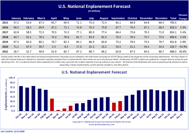 Get Ready For A January Surprise. The Airports:USA forecast for January indicates about 44 million fewer national enplanements in January compared to last year. The assumption is that the vaccines being delivered as a result of Operation Warp Speed will re-establish some semblance of confidence among public officials.