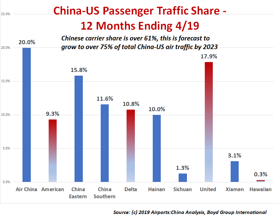 Another key point is that it will be Chinese airlines that will be the major players – either to their US alliance partner’s hubs, or via one of the emerging independent Chinese carriers. As the graph indicates, today traffic on US airlines metal is less than 40% of the total… and as the market even grows, that share will still decline to less than 25% by roughly 2025.