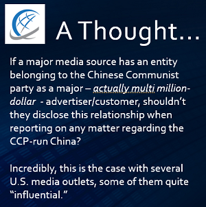 The question comes up whether in stories done covering China, this business relationship – the CCP being a more than million dollar annual (on average) advertiser – should be disclosed. Furthermore, due to the clear nature of the CCP, and its repressive nature toward free speech and human rights, it might be suggested that the propaganda nature of the inserts should be clearly illuminated, and not just routinely placed, along with ads for watches or automobiles or expensive clothing.