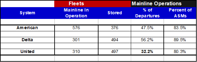 Without getting too deep into the numbers – which are changing daily – it’s clear that the three systems have different rebound and fleet strategies. (Note that the Delta data for stored aircraft do not include recently retired fleets of MD-88, MD-90, and soon to go B717s.)
