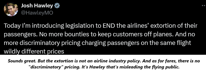 (As an aside, Hawley still has anger over an event on American, back in Covid days, where his wife was threatened by a flight attendant of being “blacklisted” unless his 5-year-old wore his mask properly. That was indeed a dark period for air service when cabin crews were tasked with enforcing this stupid rule and did so often very thuggishly. He has a right to be ticked, but that was then, this is now.)