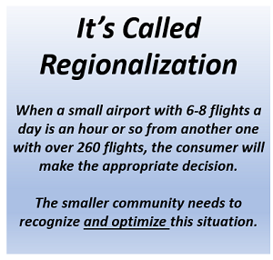 The Goal Is Not Just “Air Service” But What It Represents. Planning for the future demands clear, unvarnished understanding that the number one objective of any community or region is to assure communication connectivity with the rest of the world. Here’s a hard fact… scheduled air service at the local airport will be only one factor. In some cases, a declining or disappearing factor. Consumers are finding superior options to what the local airport can support.