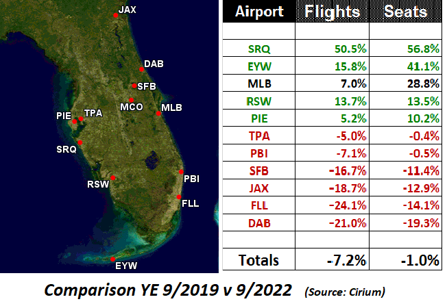 Relying on data from our friends at Cirium, we accomplished a quick comparison of the capacity changes at non-hubsite airports outside of the Panhandle (read: ex-Miami) between the full year ending in September 2019 and the same period ending September 2020.