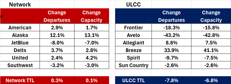 But on the ULCC ledger – which comprises a fundamentally different airline business – the projections range from less than 2% growth (Allegiant) to almost 20% at Frontier. Percentage comparisons with Breeze and Avelo are not meaningful as both airlines were in start-up mode.